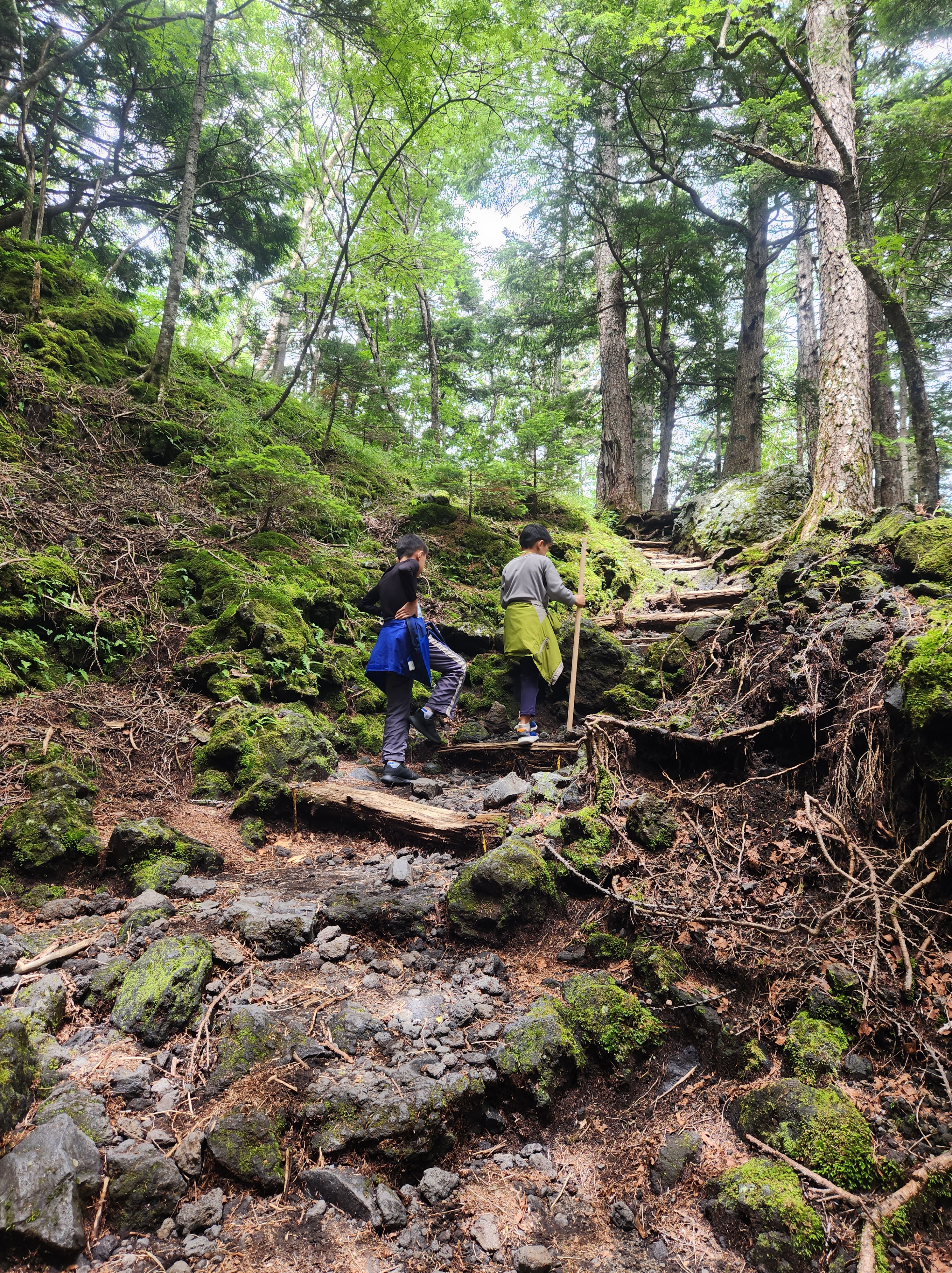 We started our hike on the Subashiri Trail around noon. Our destination for that day was our mountain hut at the 7.5th station where we would spend the night. The trail began like many wooded paths, lined with trees that provided shade, big stone steps and exposed roots that we had to climb over. Thankfully, about every mile there were mountain huts where hikers could rest, buy water, and use the restroom.