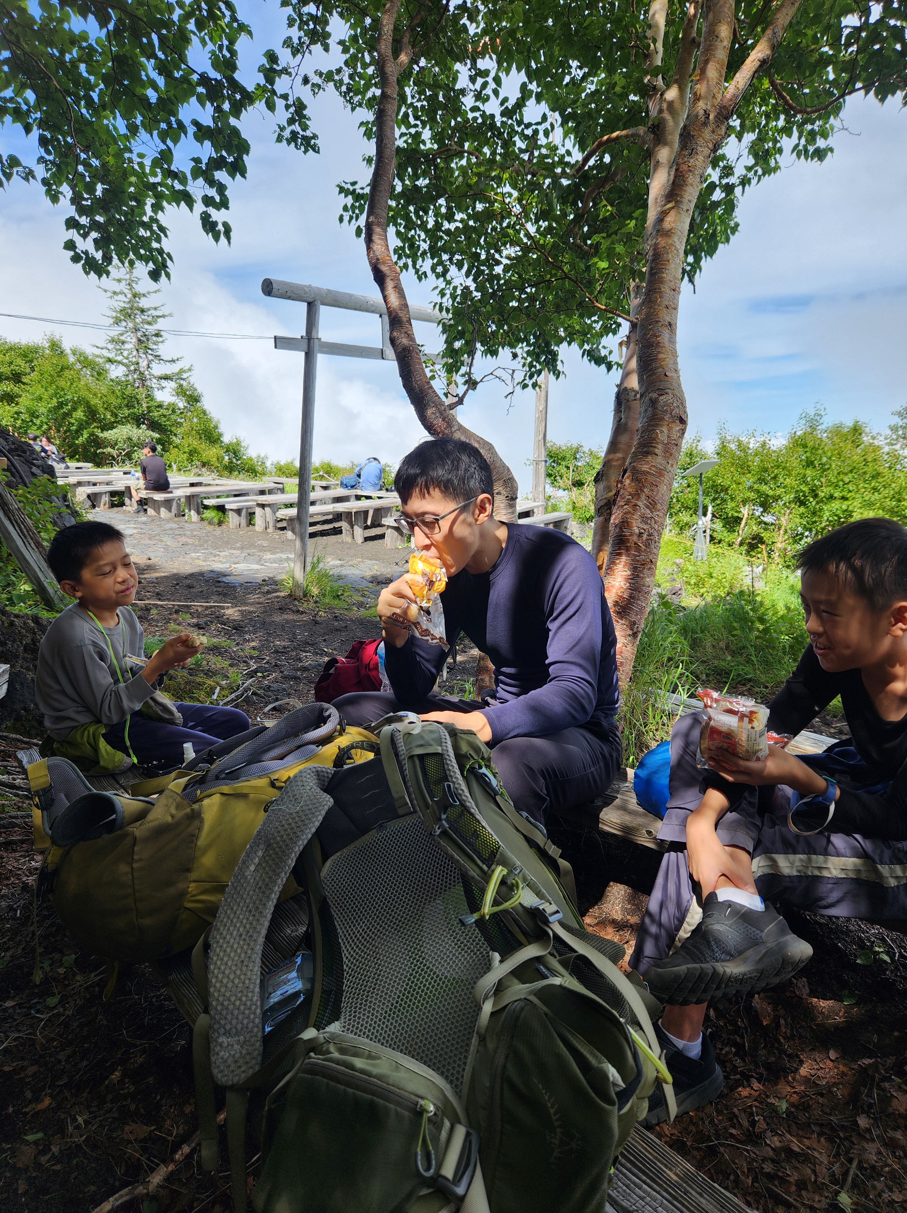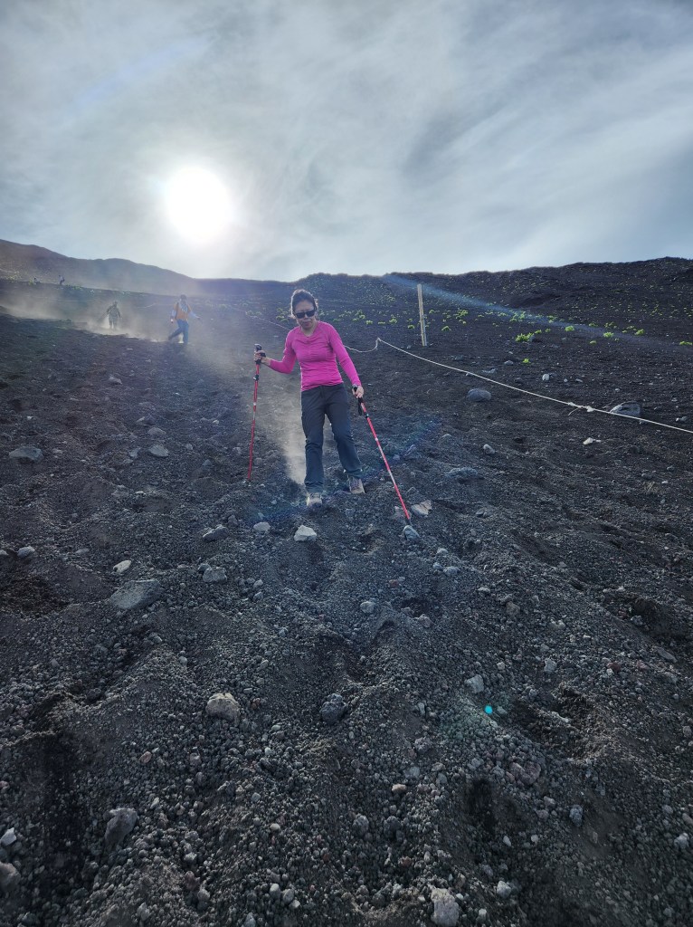 Around noon, we began our descent, which took much longer than expected. The trail down was super steep and covered in loose gravel, offering little grip and made me extremely nervous. The Subashiri Trail also has a “sand run” section, where people literally run or slide down. My boys found it fun, but I thought otherwise. It felt like skiing on volcanic sand!