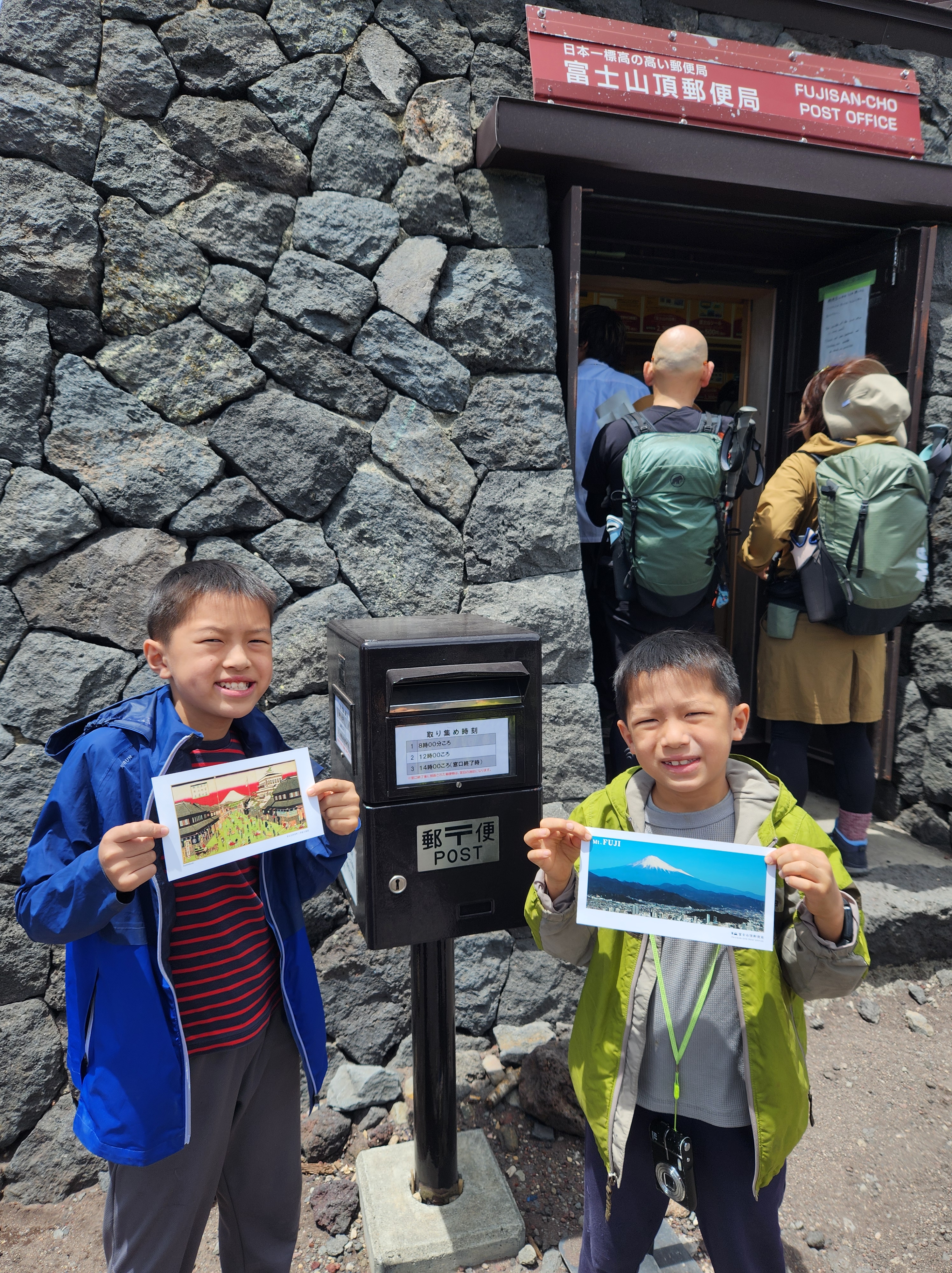 We spent about an hour at the summit, wandering around the crater. The boys mailed postcards – yes, there’s an actual post office on top of Mt. Fuji! Later, we discovered that there’s an even higher point along the crater called Kengamine, considered the true peak of Mt. Fuji. Descending from there was an adventure in itself. It was by far the steepest part of the hike. People were literally slipping and sliding down, and Baba and I had to cling to the side railing for dear life. The picture below doesn’t do it justice!