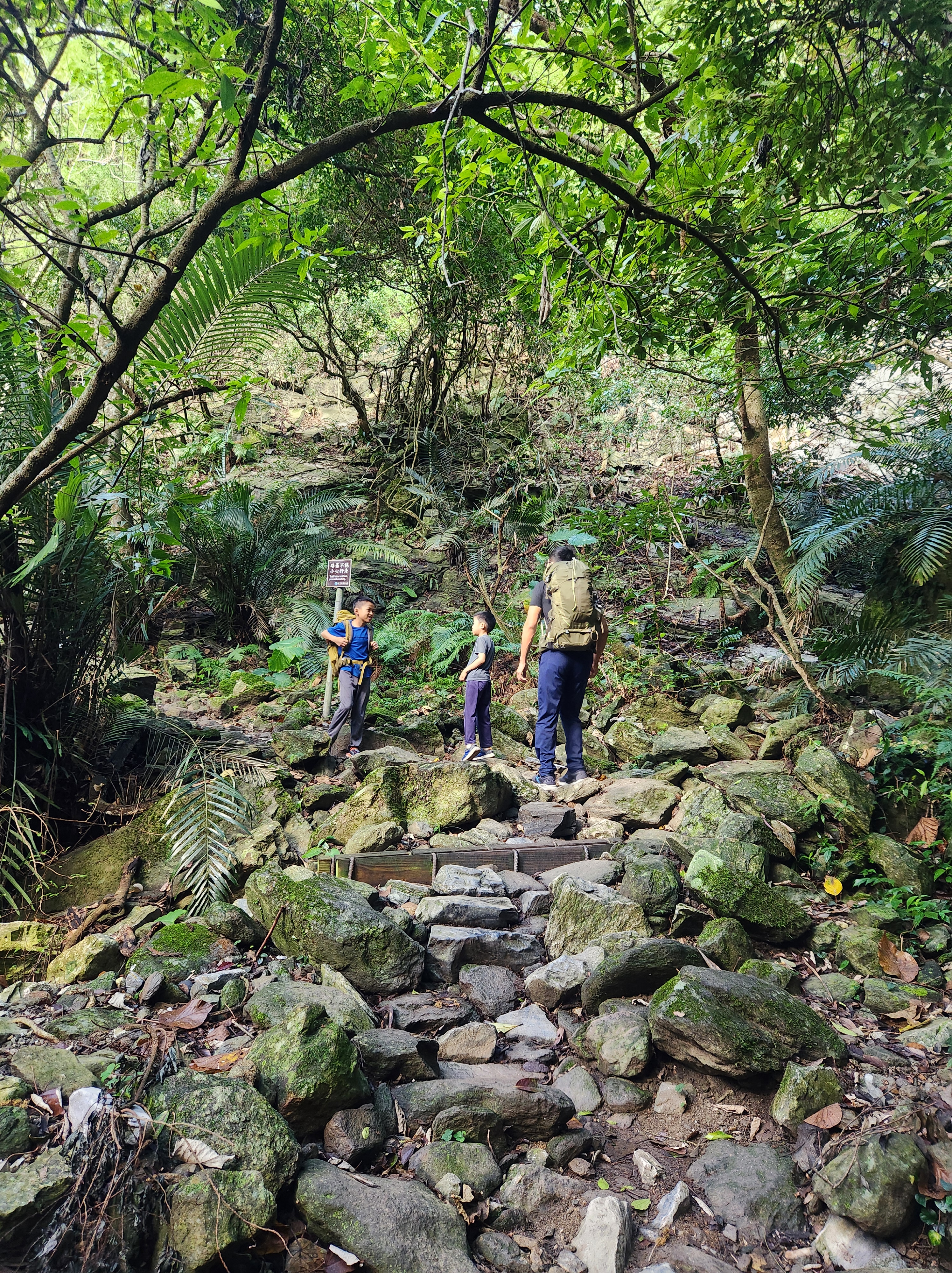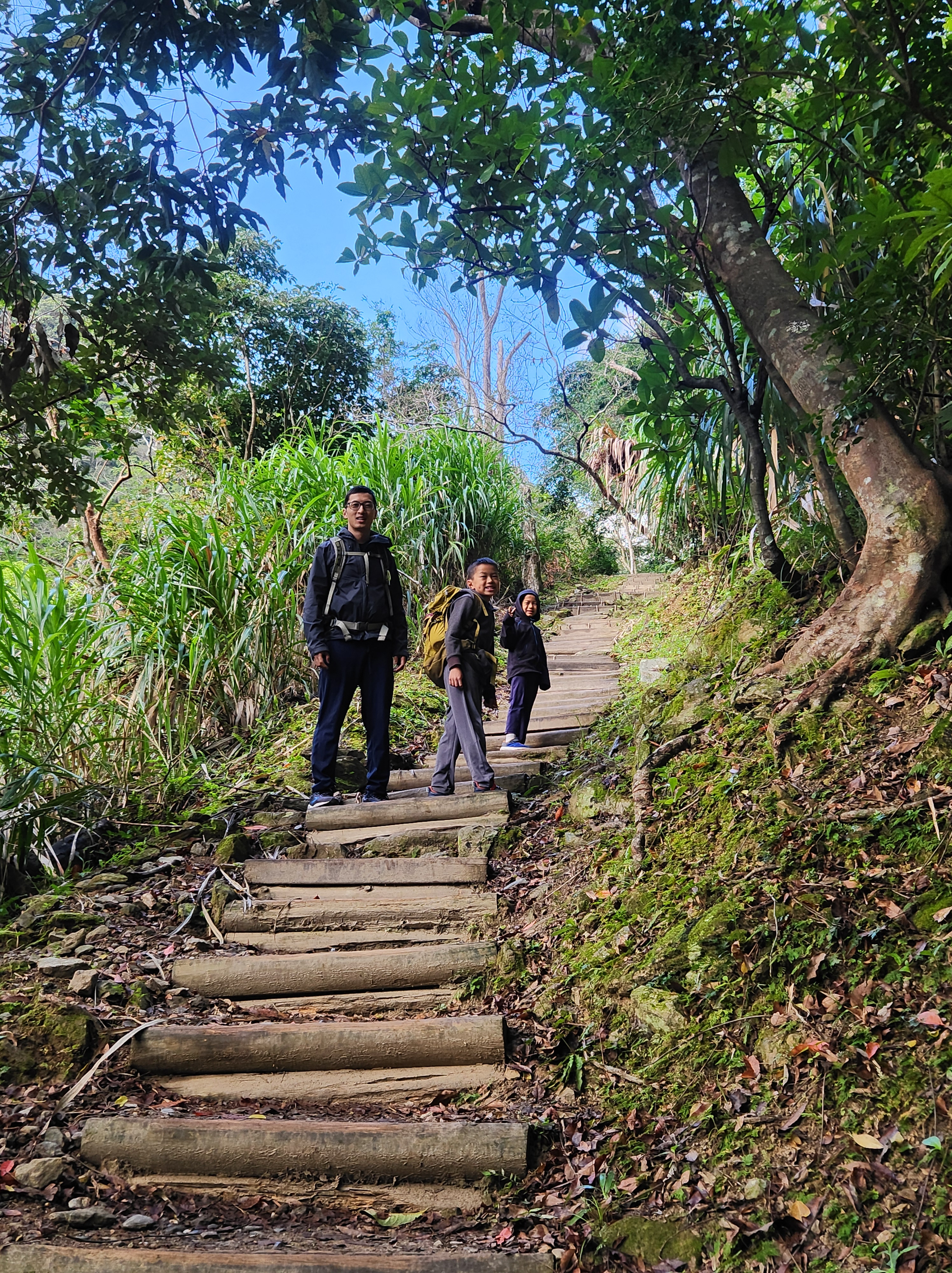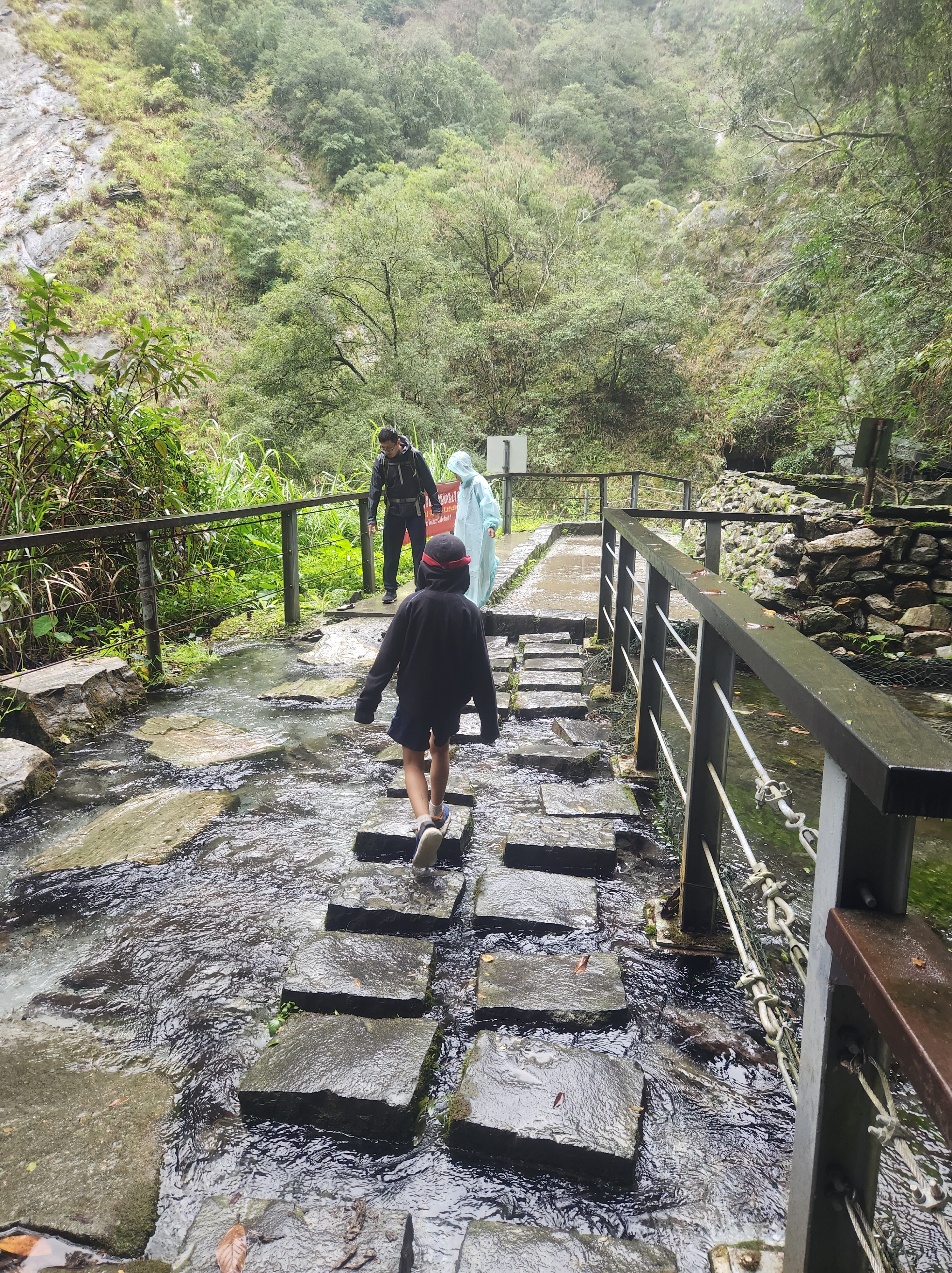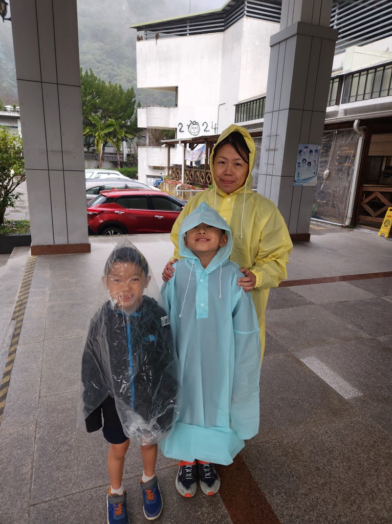 On the day we left, we squeezed in one last hike: the Baiyang Trail. This hike was relatively relaxing as the trail was paved and flat. We were told by another hiker to wear a raincoat because of the waterfall, so we went to 7-11 to get ponchos. None of them were small enough to fit O however, so being the responsible parents that we are, we used a plastic bag instead. 🤣