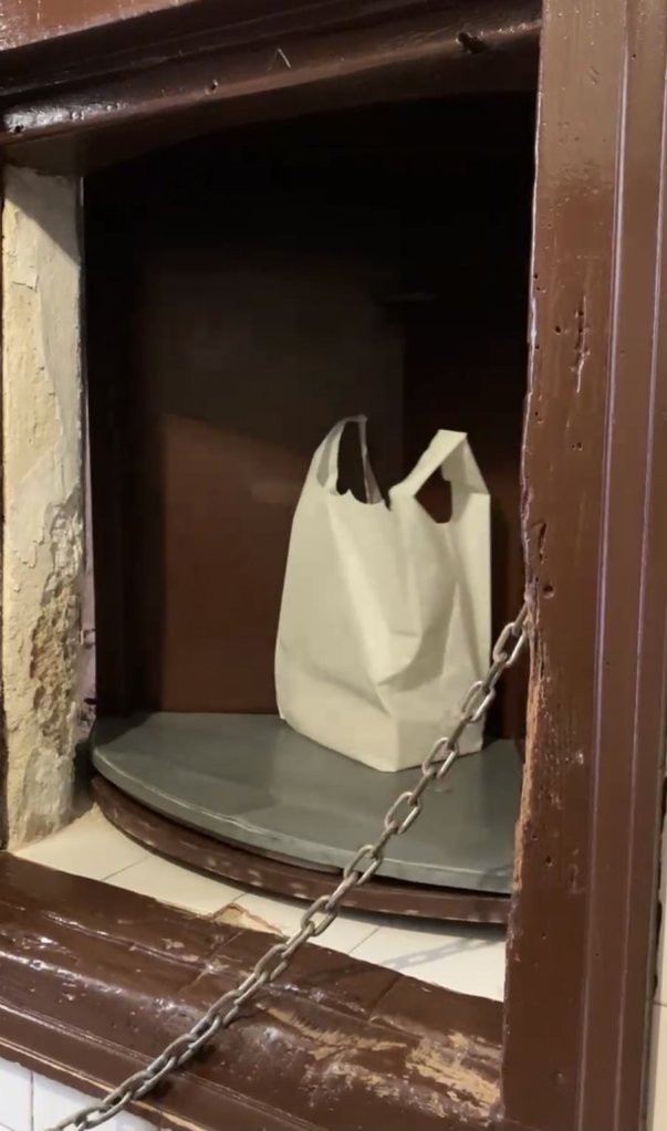 Here comes the interesting part. Since the nuns are forbidden from contact with the outside world, the entire transaction is completed using a turnstile/lazy Susan (pictured below). You say your order into the turnstile, place your money on it, and within a few minutes, it would turn and your cookies would appear along with any change! It was so fun to witness. This was also the only time we had to use cash in Spain. Can you imagine if the nuns accepted Apple/Google Pay? 😂