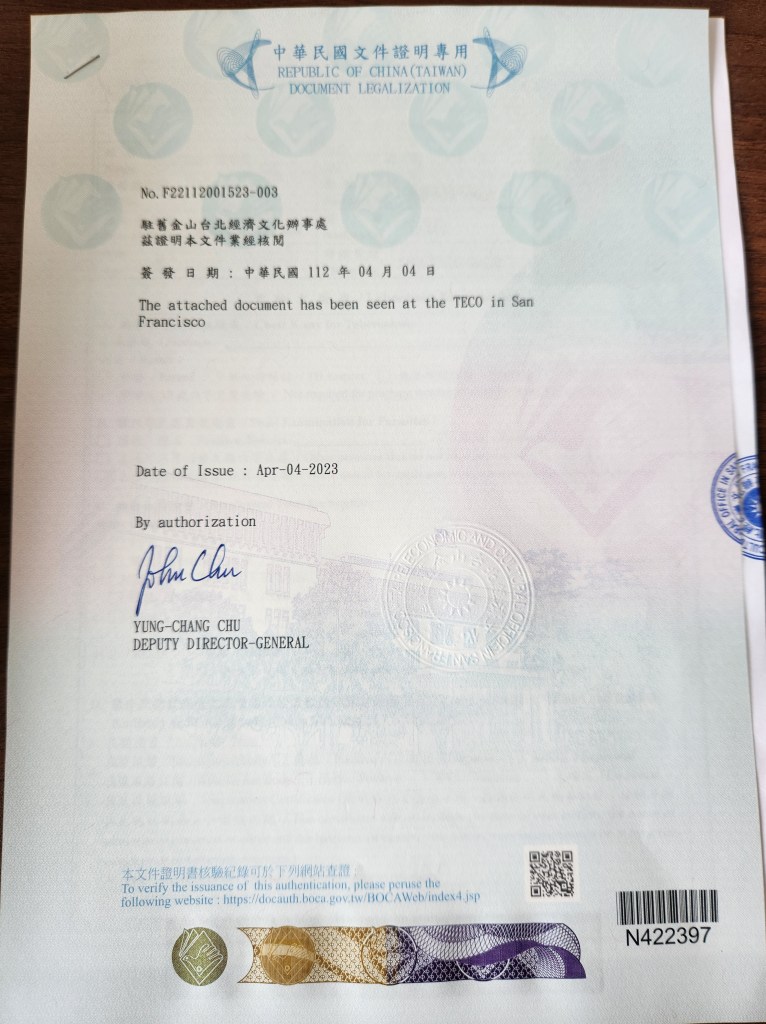 Within a week of going to the Taiwan consulate, we received our authentication certificates in the mail! They attached an official letter to each of the documents we needed to authenticate, which included the boys’ birth certifications and vaccination records.
