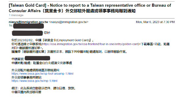 But then, on the evening of March 6, I received the fantastic news: my application got approved! The next step was to submit my passport for inspection, and go through a final review by the National Immigration Agency. On March 15, I received my temporary Taiwan Gold Card. (I will need to pick up the official Gold Card when we’re in Taiwan.)